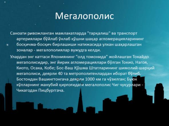 Шу билан бирга шуни таъкидлаш керакки, бу ерда шаҳарлар ҳақида гап кетганда биз албатта уларнинг расмий чегаралари ичидаги шаҳар аҳоли пунктларини эмас, балки ушбу чегаралардан ташқарига чиқадиган шаҳар агломерациясини, табиий равишда юқори даражадиги аҳоли яшаш жойларини назарда тутамиз.