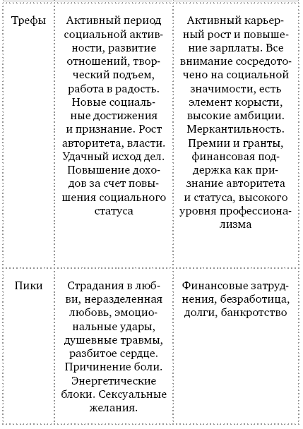 Пики с Бубнами – резкие и неожиданные события, связанные с деньгами, «как пришли, так и ушли»: внезапная прибыль и тут же вынужденные траты (на здоровье, оплату штрафов, если еще и с Трефами – добавляется значение «суды, административные разбирательства»). Неприятности в бизнесе, с документами и деловыми партнерами. Проблемы со здоровьем.