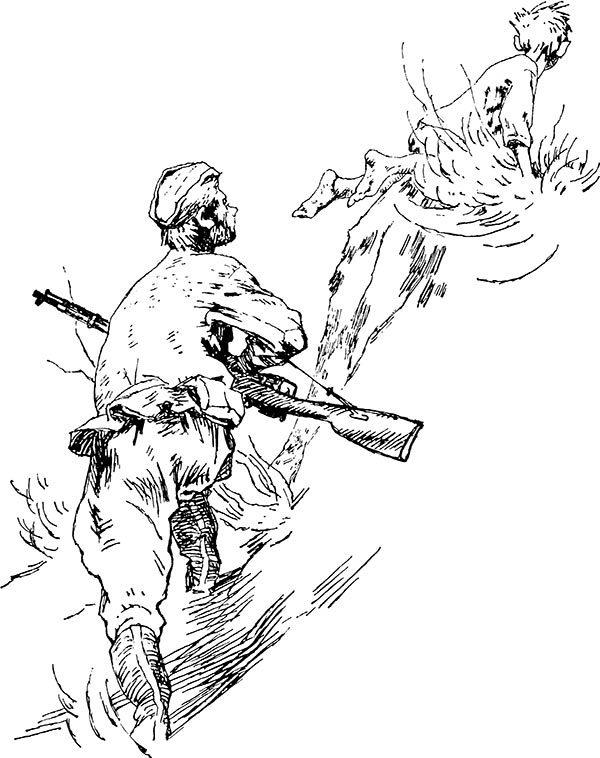 Над моей головой забу́хали тяжелые кованые сапоги. Потом раздался выстрел. Я понял: дружок мой нарочно бросился бежать в сторону от оврага, чтобы отвлечь немцев от меня. Я прислушался, задыхаясь. Снова ударил выстрел. И услышал я далекий, слабый вскрик. Потом стало очень тихо… Я как припадочный бился. Я зубами грыз землю, чтобы не закричать, я всей грудью на свои руки навалился, чтобы не дать им схватиться за оружие и не ударить по фашистам. А ведь нельзя мне было себя обнаруживать. Надо выполнить задание до конца. Погибнут без меня наши. Не выберутся.