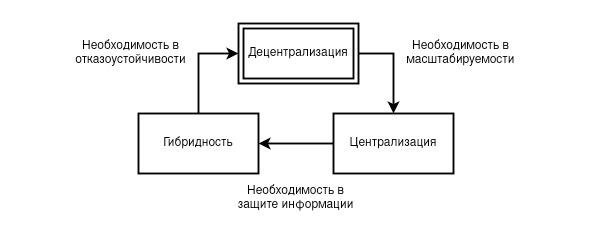 Гибридность как третья форма развития Интернет-коммуникаций начинает отрицать централизацию как нежизнеспособную систему в условиях защиты информации и в то же самое время синтезировать результат отрицания с децентрализацией. Оставляя масштабируемость, но отрицая внутреннее развитие централизации, образуется синтез внешнего развития децентрализации как способа транспарентного доказательства функционирования без слоёв абстракций и симулякров третьего порядка. Такая система становится маловосприимчивой к внутренним и внешним атакам, т. к. более не существует внутреннего сотрудника, разглашающего данные клиентов; государству становится не под силу эффективно контролировать информацию; рекламодателю становится невыгодно вкладывать свой капитал. Подобный прогресс являет собой также и относительный регресс, потому как сама жизнеспособность системы начинает зависеть от участников, выдвигающих себя на роль её поддержания, подобно энтузиастам, волонтёрам или нодам, способным получать прибыль от донатов или внутреннего механизма (криптовалюты). В любом случае в таких системах более не существует постоянного финансирования, а централизованные системы, в частности и само государство, начинают быть враждебными к её существованию [10]. Порождённость централизацией и враждебность к ней становятся ключевыми факторами противоречия и главным фактом последующего разложения гибридности посредством её планомерного разделения, расщепления и совершенствования.