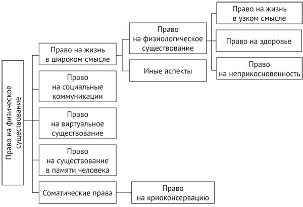 Феномен физического существования индивида традиционно связывается с человеческим телом. Это невозможно отрицать. И все же для физического существования человека важно сочетание природного и социального элементов, ибо у человека в жизни существует полная зависимость от предметов (объектов) естественной необходимости (питания, воды, чистого воздуха и т. п.) и социальной защищенности его бытия. Вот почему для физического существования человека важно наличие как здорового питания, чистой пресной воды, благоприятной окружающей среды, безопасности жизнедеятельности, так и качественное, доступное, своевременное медицинское обслуживание, охрана здоровья, саморазвитие, безопасные условия жизни и труда, гарантированность которых раскрывается через разветвленную систему субъективных прав и свобод, в числе которых право на физическую неприкосновенность, право на жизнь, право на здоровое питание, право на благоприятную окружающую среду, право на социальное обеспечение, право на медицинскую помощь и т. д. Их наличие не только способствует сохранению естественно-природного в физиологии человека, но и создает предпосылку для эффективной реализации прав человека. Комплексное соотнесение с потребностями человеческого бытия современной жизни — физическими, социальными, духовными — в классификации прав прежде не проводилось. Соответственно, право на жизнь, право на физиологическое существование, право на охрану здоровья, право на благоприятную природную среду, право на социальные коммуникации, право на существование в памяти о человеке, право на виртуальное существование, соматические права, право на криоконсервацию не были взаимосвязаны как правомочия, влияющие на физическое существование человека (личности).