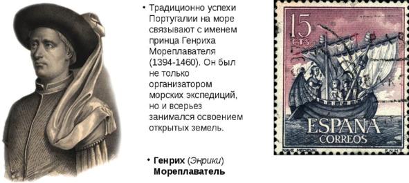 Вдохновителем и организатором морских путешествий был принц Португалии Энрике Мореплаватель.
