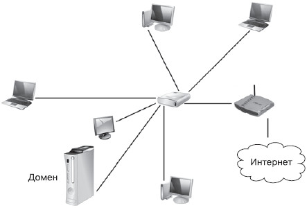 Одноранговая сеть (рис. 1.1) является наиболее простой и дешевой в создании. Тем не менее она способна обеспечить своих пользователей всем необходимым для получения доступа к нужной информации, в том числе и к Интернету.