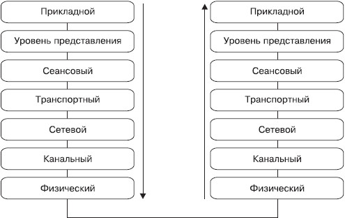 Уровни имеют названия и расположены в следующем порядке: физический канальный, сетевой, транспортный, сеансовый, уровень представления данных и прикладной уровень. Данные могут передаваться как в указанном, так и в обратном порядке. Так, при передаче данные начинают свое движение с прикладного уровня и доходят до физического уровня, который представляет собой среду передачи данных. Если же данные принимаются, то они проходят путь от физического до прикладного уровня (рис. 3.1).