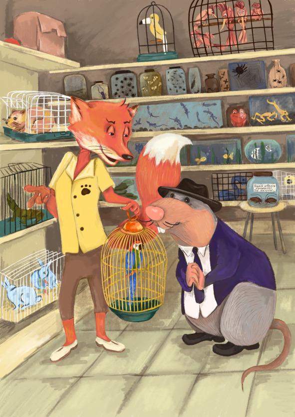 — Да, я понимаю. Я вижу, что вы хороший человек и солидный клиент. Тараканы не масштаб для такого покупателя. Вот, пожалуйста, вас наверняка заинтересует эта птица, — лисья лапа указала направо.