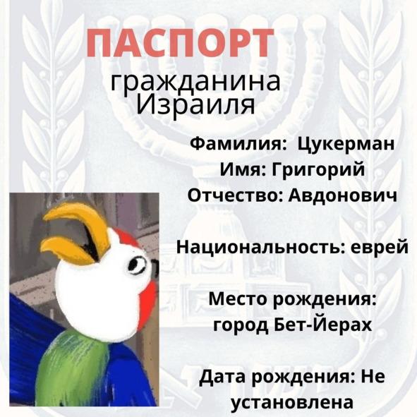 В одной палате куковал вместе с математиком Гурвичем. Тот потом в Израиль выехал, стал министром безопасности, Грише документы выправил, будто у попугая вся родня — семит на семите сидит и семитом погоняет. Посольству своему в Москве Соломон Аронович приказал выписать птахе израильский паспорт на фамилию Цукерман и билет оплатить до Тель-Авива. Но Гриша лететь отказался: «В России, — говорит, — я сложился как личность, здесь и умру». Патриот — не приведи Господь!