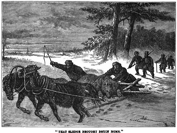 “Jack and I were both in the melée next moment. The merciful moon shone out, and we could see our guide on his feet covered with blood, but defending himself bravely with a brawny fist and a broken lantern. Not far off was our burly camp-dog engaged with three of the hungry-eyed monsters. Jack and I soon turned the odds to deadly game, but Walter was badly wounded, and it took weeks to get him well. It seems he had taken his lantern and gone out to see if the horses were secure, when he was at once attacked by the wolves. Winter brought us visitors from the far north, the grizzly bear and his cousin the cinnamon bear. They used to hide in the darkest and deepest nooks of the forest by day, or in rocky dens by the mountain sides, and come prowling out by night, oftentimes making the woods shake with their terrible roaring.