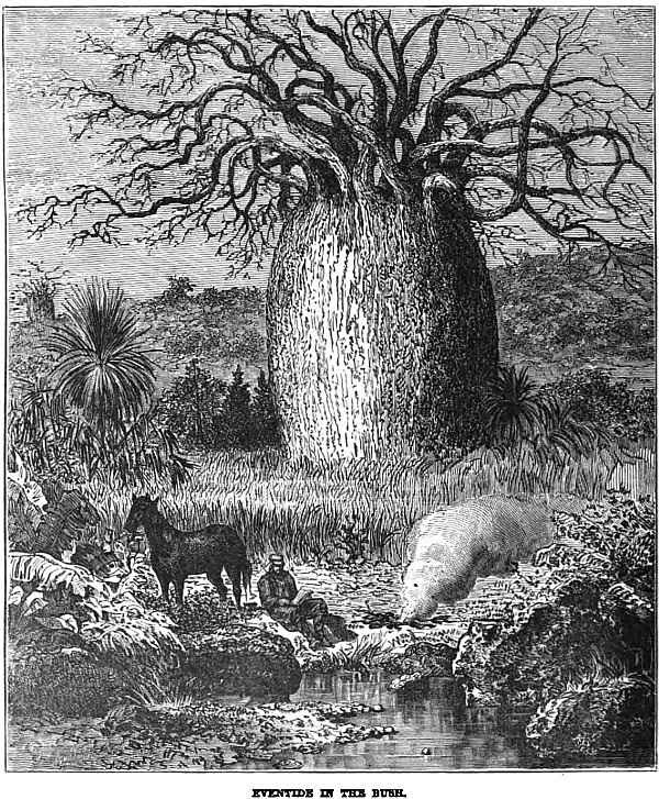 “For many months after we had once crossed the prairie-lands, and the terrible alkali flats, we followed the course of a broad-bosomed river, so that our compasses were of but little use to us, for one day this stream would take us right away up north, the next day west or south-west. It certainly was in no great hurry to reach its destination; but neither were we, so it just suited us. We were contented, nay, more, we were perfectly happy; we slept at night as hunters sleep, and we awoke at early dawn fresh as the forest birds that flitted joyously around us, and quite prepared for another day’s work. It was work sometimes, too, and no mistake; work that many a British ploughman would have considered toil, for we had our waggons to fetch along, and that sometimes entailed long journeys round, to avoid a forest too dense, or river banks too rocky.