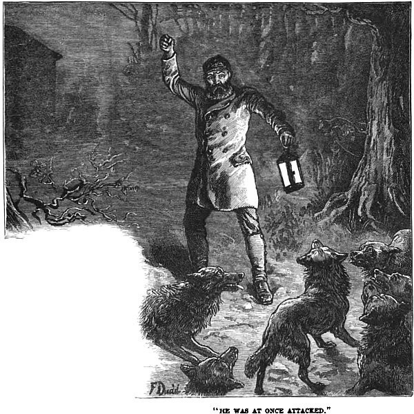 “There were trees all round our humble abode, and wearisome enough it was sometimes to awake on stormy nights and listen to the wild wind roaring through their branches, mingling with the awesome cry of the forest wolves. On just such a night Jack and I once started from our beds, and sat up and listened. There was the dread of some impending danger lying like a lump of lead at my heart, and Jack afterwards confessed that he too was awakened by the same kind of feeling. Almost in the same breath we called aloud to our guide. There was no answer, but a rush of cold wind that swept through the cabin told us that the door was open. We sprang at once from our couches and hurried on some clothing, then seizing our pistols we sallied out; just as a cry for help fell upon our ear, a cry that was drowned the next moment in the horrid ‘hubbering’ sound that wolves make while worrying a victim. ‘Come on, Jack,’ I cried; ‘they are killing poor Walter.’