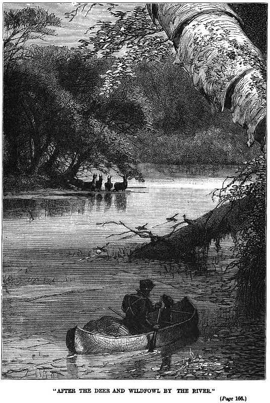 “For months we never came across the trail of a living soul, so that we were not afraid to picket our horses, leaving them plenty to eat and drink, and go off pleasuring for days at a time in our birch canoes, after the deer and wild-fowl by the river, or the swans by night. We knew, or we could generally guess, where their haunts were. Erecting a bit of canvas in the stern sheets, by way of cover, we would light a bundle of hay, and throw it overboard, then drop slowly down stream before it. If they were anywhere about, they were sure to be out soon; and as they came sailing towards us, wondering what was up, one or two of them was sure to pay for his curiosity with the forfeiture of his life.”