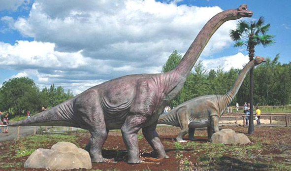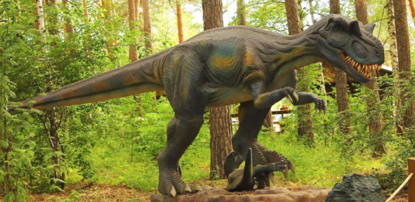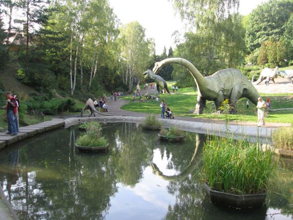 Долина динозавров — довольно большая территория в виде котловины, населенная двадцатью двумя бетонными зверьми, изготовленными в натуральную величину и находящимися в естественных позах: или они пасутся, или выясняют отношения. Эти звери жили на земле миллионы лет назад. В общем-то, во многих парках имеются макеты доисторических животных, но этот единственный, где они выполнены в натуральную величину, расположены среди зелени, и в отдельности, и группами изображают фрагменты своей жизни. Надо сказать, собранные вместе, поражают они многообразием форм и размеров. Ощущение, что это не земные животные и завезены к нам с какой-то другой планеты.