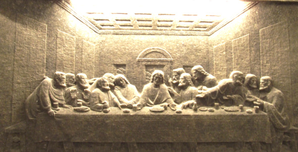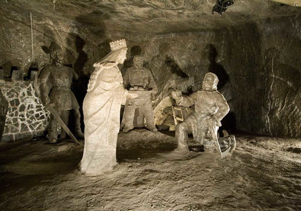Мы видим скульптурную композицию, которая иллюстрирует легенду открытия залежей каменной соли в Польше. Жила-была в XIII веке дочь короля Венгрии, которая должна была выйти замуж за правителя Польши Болеслава V, и звали ее Кунигундой, короче — Кингой. Отец дал Кинге в приданое одну из шахт в Карпатах, и дочь, не желая выходить замуж, бросила туда свое обручальное кольцо. Замуж выйти ей все равно пришлось, поэтому перстень волшебным образом из соляной шахты в Карпатах переместился в Величку, причем Кинга точно откуда-то знала, где именно его стоит искать, и велела копать шахтерам в указанном ею месте. Скульптуры в Величке как раз иллюстрируют передачу вновь обретенного обручального кольца его владелице.