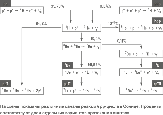 Но чаще идут другие реакции. В 84,6% случаев два ядра гелия-3 взаимодействуют друг с другом, порождая ядро 4He и два протона. В оставшихся 15,4% начинается другая цепочка реакций: гелий-3 взаимодействует с гелием-4, образуя ядро бериллия-7 (7Be) и испуская гамма-квант. Однако бериллий не является конечным продуктом, он вступает в реакцию или с электроном (99,89% случаев), порождая литий-7 (7Li) и электронное нейтрино, или с протоном (0,11%), порождая бор-8 (8B) и гамма-квант. В свою очередь литий-7 захватывает протон и распадается на две альфа-частицы, а бор-8 превращается в возбужденное ядро бериллия-8 с испусканием позитрона и электронного нейтрино (это так называемые борные нейтрино, из всех рождающихся в Солнце в заметном количестве они имеют наибольшую энергию). И, наконец, ядро бериллия распадается на две альфа-частицы.