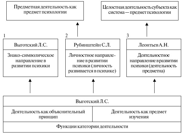 В решении вопроса о «психологизации» и «индивидуализации» этой категории и «введении» ее в реальную ткань психологического исследования научные пути Л. С. Выготского как одного из основателей деятельностного подхода и других крупных исследователей проблемы деятельности, в том числе и его учеников-последователей (А. Н. Леонтьева, др.), разошлись. (Содержание направления развития деятельностного подхода у С. Л. Рубинштейна, система его взглядов и взглядов его последователей рассматриваются далее в п. 1.7.).