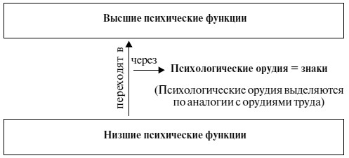 Высшие психические функции возникают на основе низших психических функций, благодаря опосредствованию психологическими орудиями, в роли которых выступают знаки (было показано выше). Изначально «психологические орудия» повернуты «вовне» к партнеру, затем они оборачиваются «на себя», т. е. становятся собственными психическими процессами, далее они «вращиваются внутрь», и т. о. психические функции опосредствуются «изнутри», отпадает необходимость во внешнем стимуле – средстве. Рассматривая процесс становления интерпсихического интрапсихическим, Л. С. Выготский обосновал связь генезиса высших психических функций с употреблением людьми в процессе их общения знака и подчеркнул, что без выполнения этой роли знак не может стать средством индивидуальной психической деятельности.