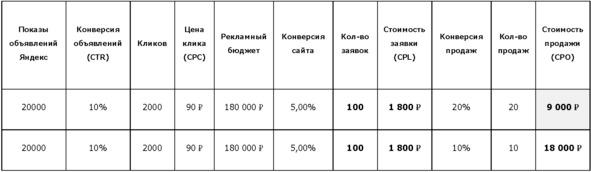 Если повысить конверсию продаж на 10%, то цена сделки уменьшится в 2 раза. Если из 100 заявок вы заключали раньше 10 сделок, а теперь станете заключать 20, то стоимость сделки и расход на привлечение 1-го клиента уменьшаться в 2 раза.