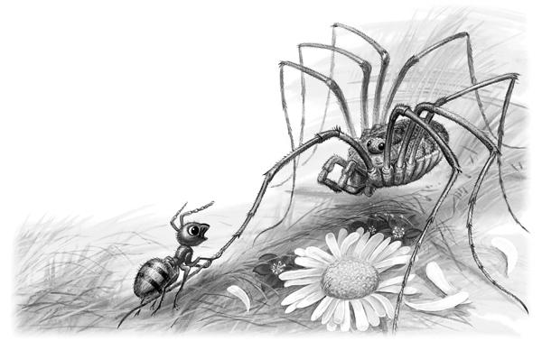 Начал Паук свои ходули переставлять – одна нога тут, другая там; все восемь ног, будто спицы, в глазах у Муравьишки замелькали. А идёт Паук не быстро, брюхом по земле чиркает. Надоела Муравьишке такая езда. Чуть было не укусил он Паука. Да тут, на счастье, вышли они на гладкую дорожку.
