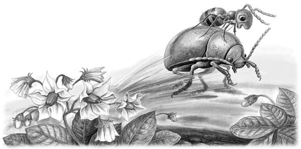 Только успел Муравьишка вскарабкаться Жужелице на спину, она как пустится бежать! Ноги у неё ровные, как у коня.