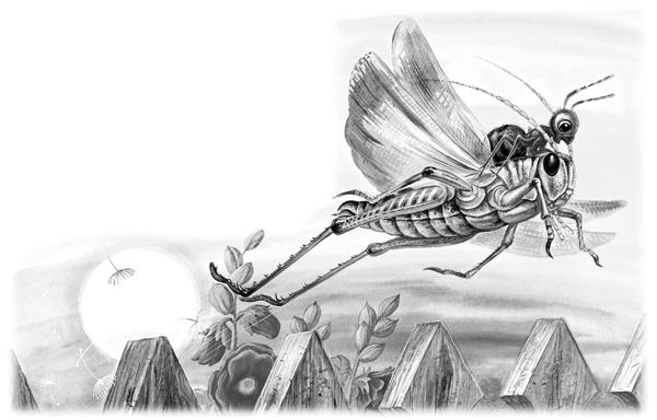 Кузнечик сложил свои длинные задние ноги пополам, потом разом выпрямил их и подскочил высоко в воздух, как Блошачок. Но тут с треском развернулись у него за спиной крылья, перенесли Кузнечика через забор и тихонько опустили на землю.