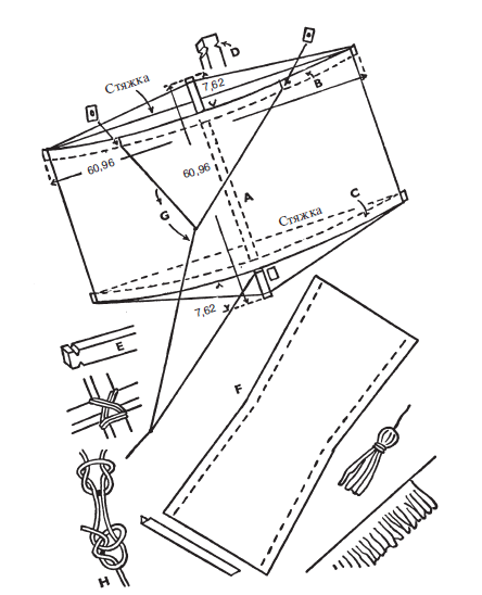 Каркас состоит из трех реек: основной – А и двух поперечных – В и С (рис. 1). Основная рейка выполняется из твердого сухого дерева (лучше сосны или ели) квадратного сечения, со стороной 0,64 см, длиной 60,96 см. На ее концах делают зарубки (D, рис. 1). Рейка должна быть ровной, без сучков или трещин. Поперечные рейки, каждая по 60,96 см длиной и толщиной около 0,64 см, изготовляют из расщепленного тростника. Тростник можно заменить деревянными рейками со стороной сечения 0,64 см, хотя они будут не так прочны и гибки, как тростниковые. На поперечных рейках тоже делаются зарубки для связывающих нитей, скрепляющих рейки (Е, рис. 1).
