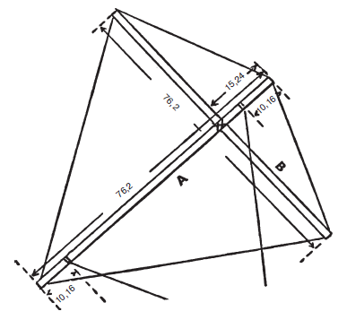Простейший каркас этого змея состоит всего из двух реек – основной и поперечной (А и В, рис. 3), которые скреплены в форме креста. Такого змея можно сделать складывающимся, тогда его удобно будет перевозить в транспорте. Для змея берутся две деревянные рейки квадратного сечения 0,95 х 0,95 см и длиной 76,2 см каждая. В торцах реек делают зарубки. Рейки соединяют в точке основной рейки, отстоящей на 15,24 см от конца. Чтобы изготовить складывающегося змея, при соединении реек не используют клея. Связывать рейки надо так, чтобы соединение могло быть быстро разобрано.