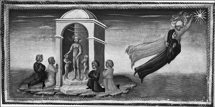 Рис. 4. «Джованни ди Паоло. Иллюстрация к "Раю", песнь 7. Ок. 1445. Справа Беатриче увлекает Данте в следующий круг Рая, слева изображено поклонение Венере, которую почитали, как сказано в "Божественной Комедии", люди "в своих прежних заблуждениях"» [13], с. 225