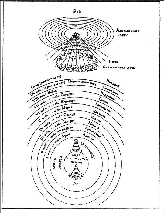Рай состоит из семи сфер-кругов: Луны, Меркурия, Венеры, Солнца, Марса, Юпитера и Сатурна. За ними – еще три неба: неподвижных звезд, первого двигателя и эмпирей. На рис. 5 приведена схема Ада, Чистилища и Рая, по Данте, выполненная современными комментаторами. Указаны и подписаны десять сфер-кругов Рая.
