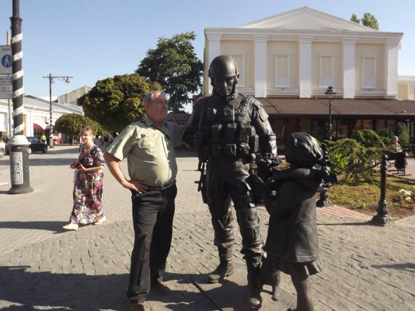 Крым. Симферополь. Девочка дарит цветы защитнику Крыма «Зелёному человечку».