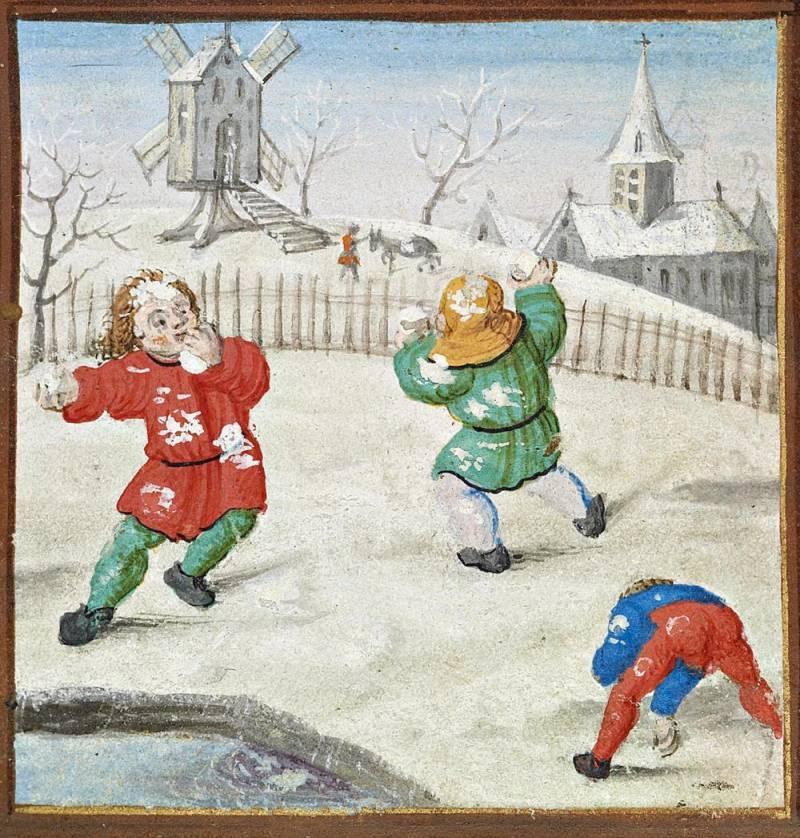 Иллюстрация из средневекового манускрипта, изображающая детей, играющих в снежки