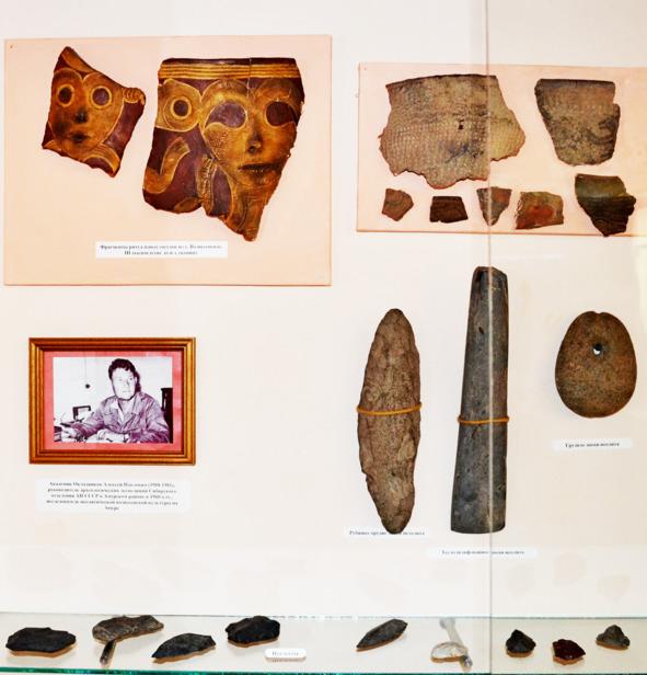Витрина с неолитическими предметами вознесенской культуры и портретом её открывателя А. П. Окладникова
