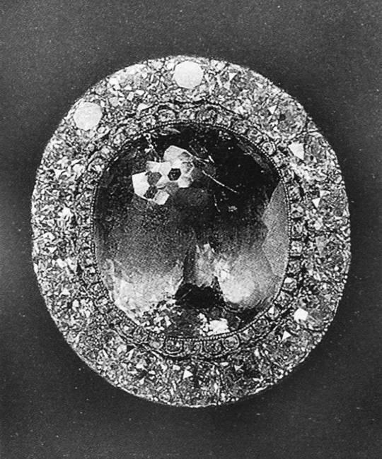 Уникум, оказывается, дар скончавшегося в 1855 году императора Николая I, считавшего любимым камнем (как, впрочем, и супруга его первенца) именно сапфир. Один из крупнейших в мире, к тому же дивной красоты и прелести, очень чистый и прозрачный цейлонский синий корунд, ровного бархатистого густо-василькового тона, покрыт в верхней части, согласно старинной индийской огранке, множеством шестиугольных мелких фасеток-граней, заставляющих дробиться лучи света, погружая его в мягкое марево полыхающих искр.