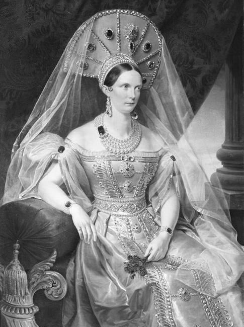 Любительницей придумывания новых нарядов была супруга Николая I. Так, для всех дам царской семьи ею был создан фамильный костюм «в готическом вкусе», напоминающий о счастливых временах прекрасных дам и верных рыцарей «без страха и упрёка». Причёску же августейших особ украшала несколько изменённая сен-сесиль, поскольку «к золотому обручу, окружавшему косу, был добавлен второй, также в пол-вершка ширины» (=2,2 см. – Л. К.), «носившийся на лбу у самых волос».[22]