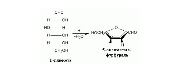 Дегидратация. В сильных минеральных кислотах высокой концентрации происходит дегидратация пентоз и гексоз (Рисунок 10). Образовавшиеся фурфурол и оксиметилфурфурол легко полимеризуются; при этом получается коричневая смола. Они также конденсируются с различными фенолами, образуя характерно окрашенные продукты; многие цветные реакции на углеводы основаны на этом свойстве.