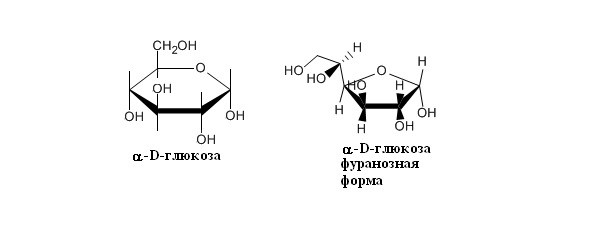 Альдегидные или кетонные группировки легко реагируют со спиртовыми, образуя полуацетальные или полукетальные группировки, чаще всего это происходит внутри молекулы, и, следовательно, происходит циклизация моносахарида, в результате образуется модифицированный гетероцикл, содержащий атом кислорода. Наиболее устойчивы пяти и шестичленные циклы. Пятичленные циклы углеводов сходны с молекулой фурана, поэтому это фуранозная форма, шестичленные с молекулой пирана – пиранозная форма (Рисунок 3). Все гидроксильные группы, расположенные справа оказываются под циклом, а те что слева – над циклом. Кольцевую структуру могут принимать и кетозы (например, D-фруктофураноза или D-фруктопираноза). В растворе глюкозы более 99% молекул находится в пиранозной форме и менее 1% – в фуранозной форме.