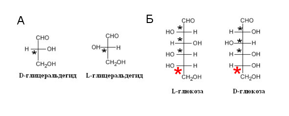 Рисунок 1. Структурные формулы стереоизомеров углеводов, * – отмечены асимметрические (хиральные) атомы. А – глицероальдегид * – отмечен асимметрический атом, определяющий принадлежность к D или L форме, Б – стереоизомеры глюкозы, крупной * отмечены асимметрические атомы углерода, определяющие принадлежность к стереоизомерам