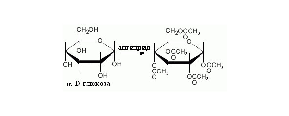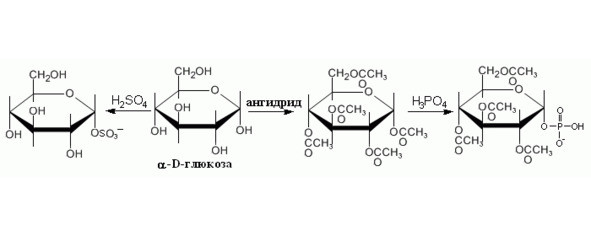 В реакцию образования сложных эфиров вступают спиртовые и карбоксильные группы, но карбоновые кислоты мало реакционно способны поэтому не вступают в реакцию моносахаридами. В реакции ацилирования используют ангидриды карбоновых кислот, их высокая реакционная способность позволяет модифицировать все свободные гидроксильные группы.