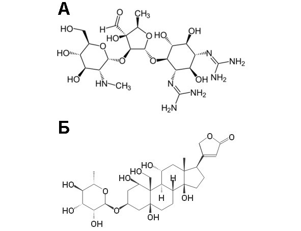 Рисунок 19. Структура некоторых гликозидов. А-стрептомицин, Б-уабаин