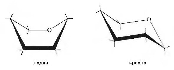 Шестичленные кольца из одинарных связей, в циклогексане и в сахарах, как правило, принимают конформацию «кресла», как это видно на примере глюкозы (Рисунок 6). Помимо этого, шестичленные кольца могут принимать менее устойчивую конформацию «лодки». Свободно переходят одна в другую через промежуточные скошенные конформации.