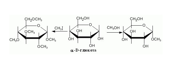 При взаимодействии со спиртами в реакцию вступает только полуацетальная гидроксильная группа, так как спирты слабо активны, поэтому образуется эфир с полуацетальной гидроксильной группой. Галогениды более реакционно способны, поэтому образуют эфиры со всеми свободными группами моносахарида.