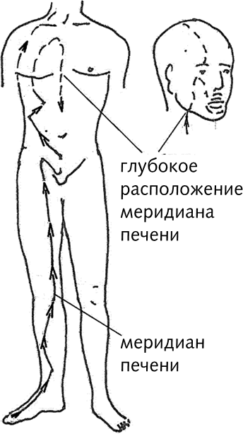 Тело постоянно отдает избыток отработанной энергии и получает порцию жизненной энергии. Чем активней происходят процессы обмена, тем здоровее организм! Энергия в восточной медицине – это материальный поток, и в организме для него отведены меридианы и области накопления. Посмотрите на рисунок 2, чтобы наглядно представить себе хоть один из 12 больших меридианов, проходящих по телу. На рисунке мы видим внешний и внутренний ход меридиана печени. Внутреннее русло проходит в непосредственном соприкосновении с органом. Воздействие на внешние точки меридиана приводит в активность и внутренний ход меридиана, импульс исправления достигает печени и работает со всей кроветворной системой.