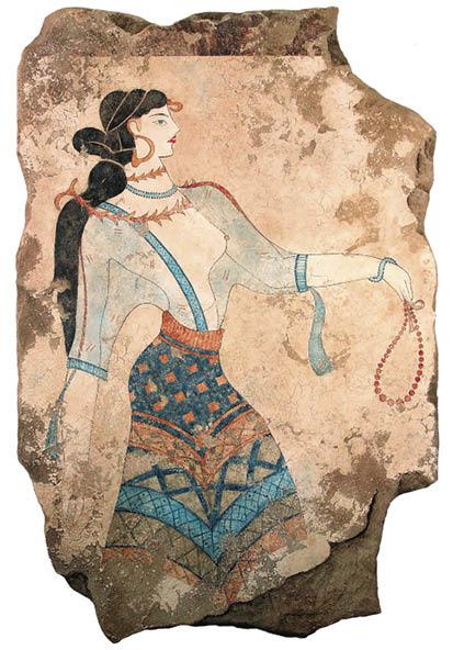 Никакие античные изображения не вызывают столь сильного ощущения светской утонченности, как фрески из музея Ираклиона, на которых мы видим очаровательных модниц в элегантных одеяниях почти современного покроя. И эта элегантность стала предметом экспорта: на многих египетских фресках изображены женщины в типично критских платьях со смелым декольте. Критские портные знакомили свою заграничную клиентуру с новинками, рассылая в качестве каталогов раскрашенные статуэтки.