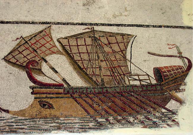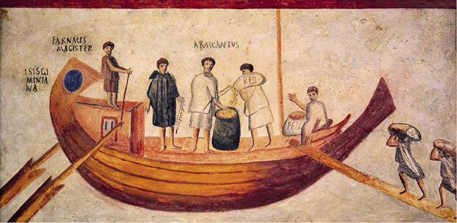 Погрузка зерна на римский торговый корабль. Изображение на фреске из Туниса. III в.
