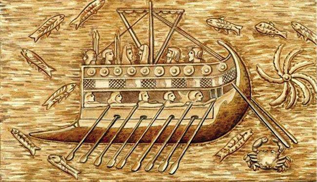 Нет, приглядитесь внимательнее. Это судно с высоко поднятым скошенным носом и округлой кормой. А вот фрагменты сосудов (2800 лет до нашей эры, найдены на острове Скирос, Киклады), на которых выгравированы тысяченожки. Но нет, это вовсе не насекомые, это суда, а то, что кажется лапками, — весла или, быть может, гребки. Если художник не преувеличил их количество, то суденышки имели около десяти метров в длину. Мачты нет. Специалисты по судостроению считают, что эти суда не были пирогами, выдолбленными из ствола дерева, а были сшиты из досок, быть может обтянутых кожей.