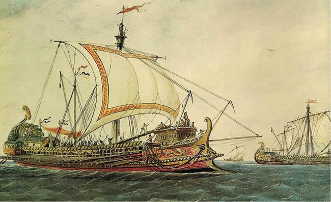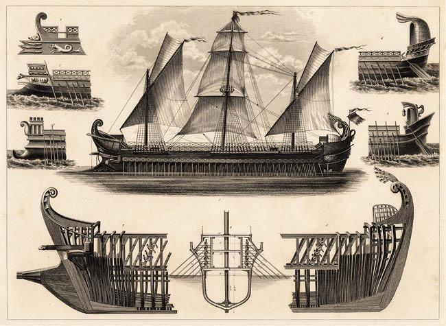 Триремы. Рисунок из книги Рафаэля Монлеона «Иллюстрированная история судоходства и судостроения». 1870-е
