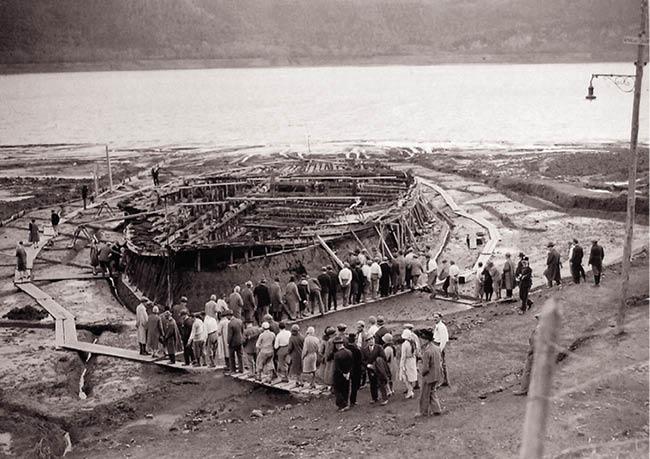 Остов корабля Калигулы, найденный в озере Неми. 1930