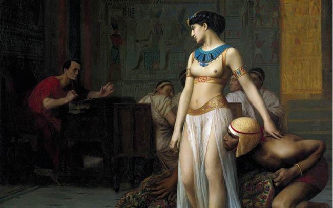 В комнату входит евнух с ковром на плече. Цезарь с любопытством глядит, как раб опускает ковер на пол и расстилает его. Внутри спрятана невысокая женщина, вернее, молодая девушка. Она вскакивает на ноги, разглаживает одежду, встряхивает головой, чтобы привести в порядок растрепанные волосы. Затем принимает величественную позу, гордо вздергивает носик и с улыбкой заявляет Цезарю: