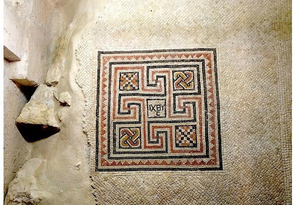 Особый интерес у нас вызвала напольная мозаика. В мраморном полу храма в нескольких местах видны деревянные крышки люков, прикрывающие фрагменты древнейшего мозаичного пола, сохранившиеся от первоначальной базилики времён Константина и Елены. В одном из них, на цветной мозаике, с типичным свастическим орнаментом и другими геометрическими фигурами, в маленьком квадрате посередине, видна греческая надпись: ΪΧΘΥΣ. Это греческое слово, означающее в переводе «рыба», использовалось в раннехристианской символике, как аббревиатура: «Иисус Христос Божий Сын Спаситель». Такую надпись и знак я много раз видел в России на багажниках автомобилей. Тогда я не знал, что это означает, теперь знаю.