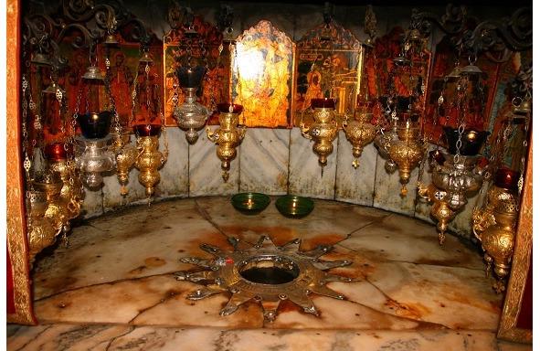 Главная цель, ради которой мы приехали в Храм, располагалась под амвоном базилики. Здесь находится величайшая христианская святыня — Пещера Рождества, почитаемая в качестве места рождения Иисуса Христа. Это место отмечено углублением в стене с четырнадцати конечной серебряной звездой на полу.