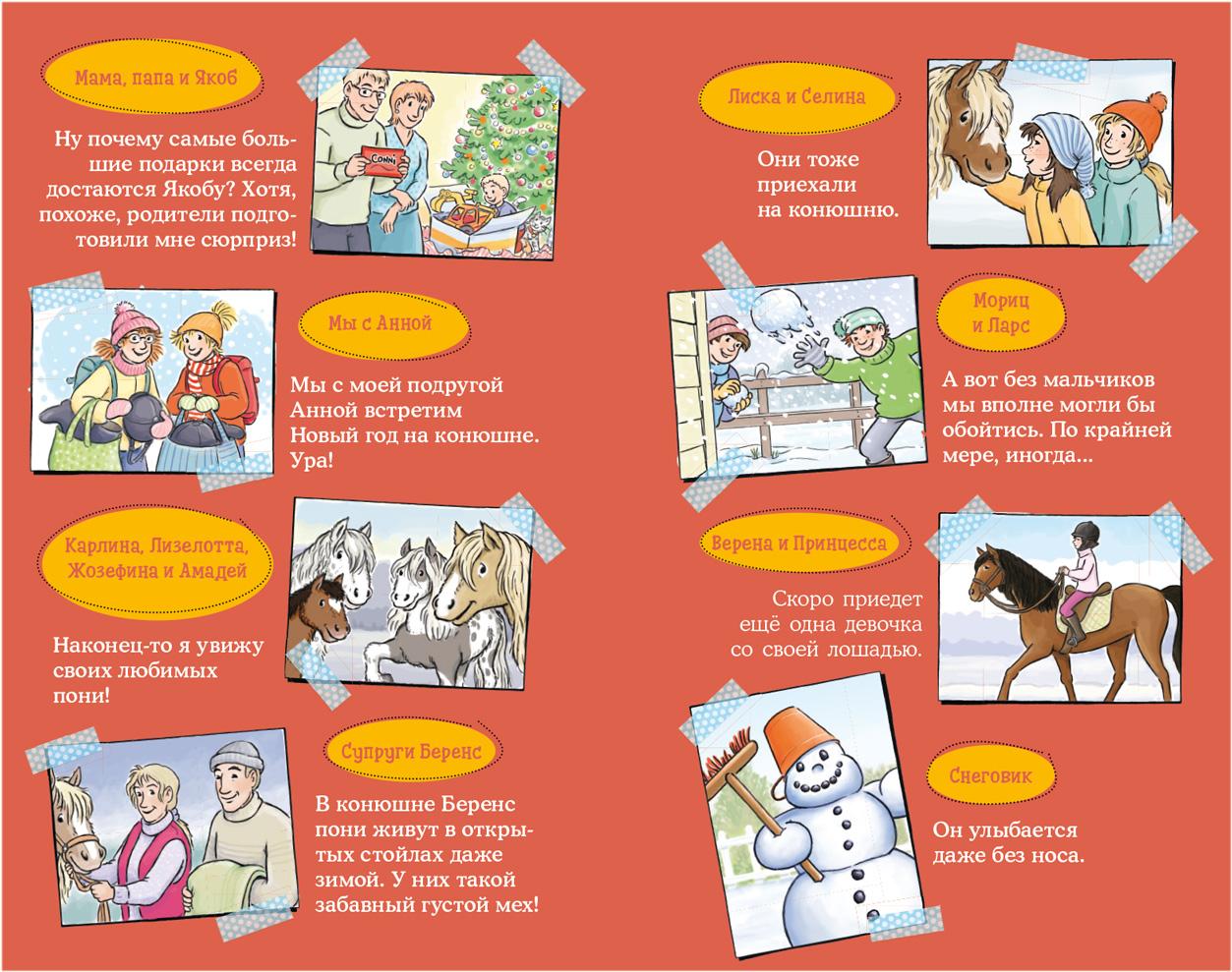 Конни уже догадалась, чтó в маленькой красной коробке: книги и диски. Так что в надежде на сюрприз она взяла другую. Коробка была немного больше по размеру, а на ощупь — мягкая и приятная. Конни с любопытством развернула подарочную бумагу. Внутри оказался новый свитер в красную полоску. Красиво, конечно, но сюрпризом не назовёшь. Якоб распаковал гигантский экскаватор, а Конни изучала первый книжный подарок — новый том её любимой серии о пони. Ну хоть что-то приятное!