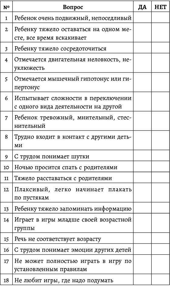Прочитайте вопросы-утверждения. Если высказывание совпадает с состоянием ребенка на данный момент времени, то поставьте галочку в столбике ДА, если такое состояние не проявляется или очень редко бывает – отметьте галочкой столбец НЕТ.